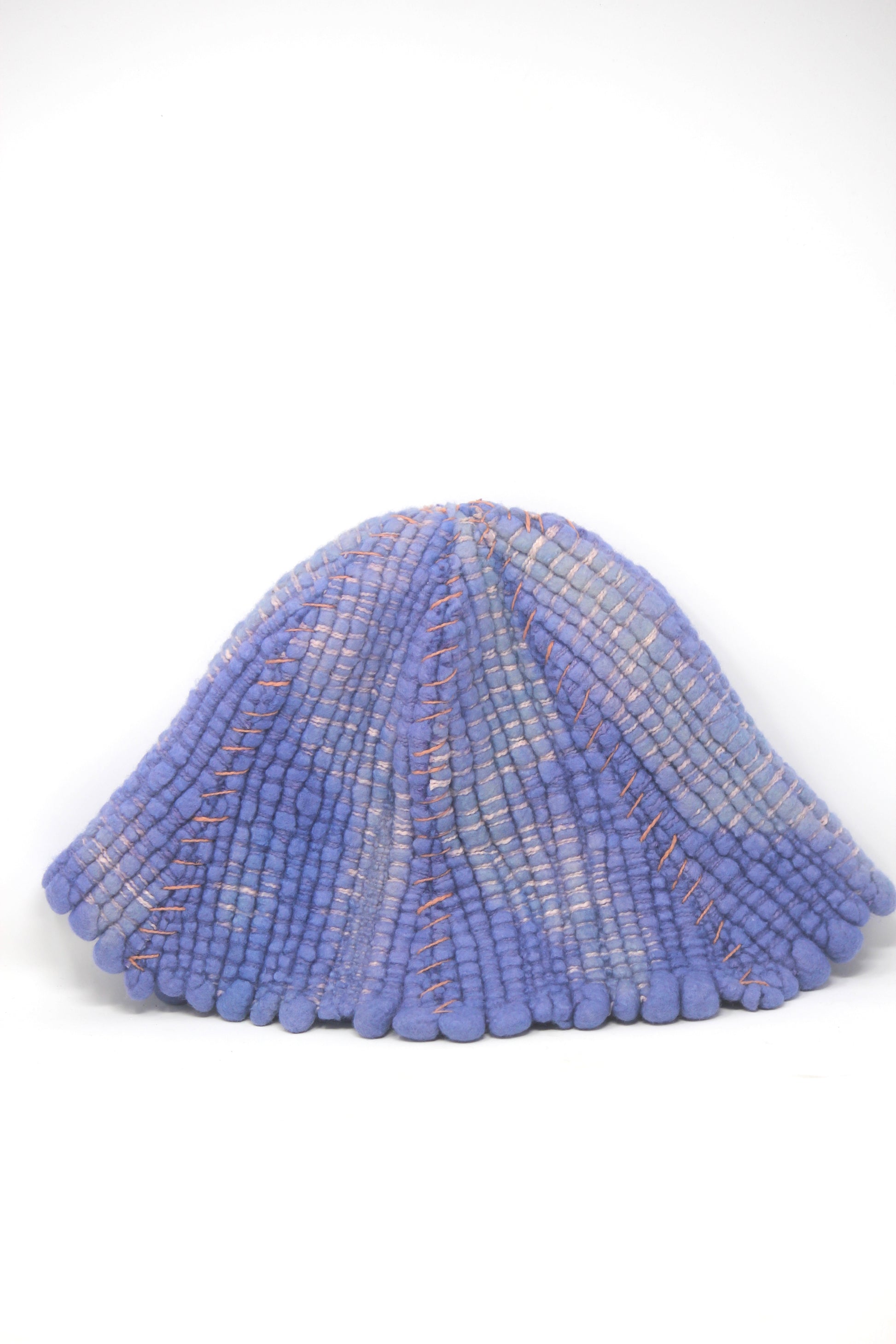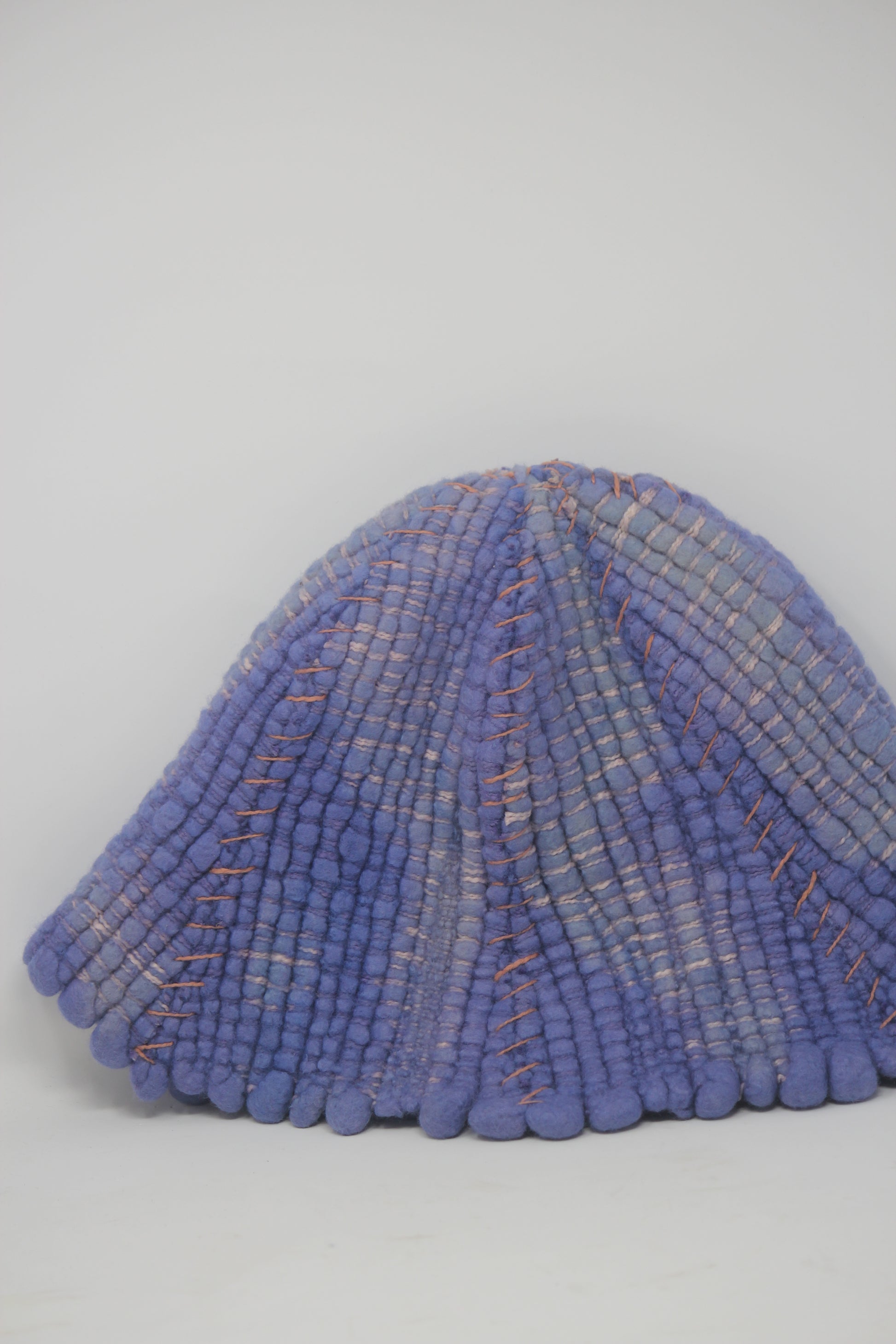 Hat is woven using merino wool and slub cotton on a rigid heddle loom. The tulip hat features 6 bell shaped panels and is somewhat loose/ oversized fit for an extra fashion statement.