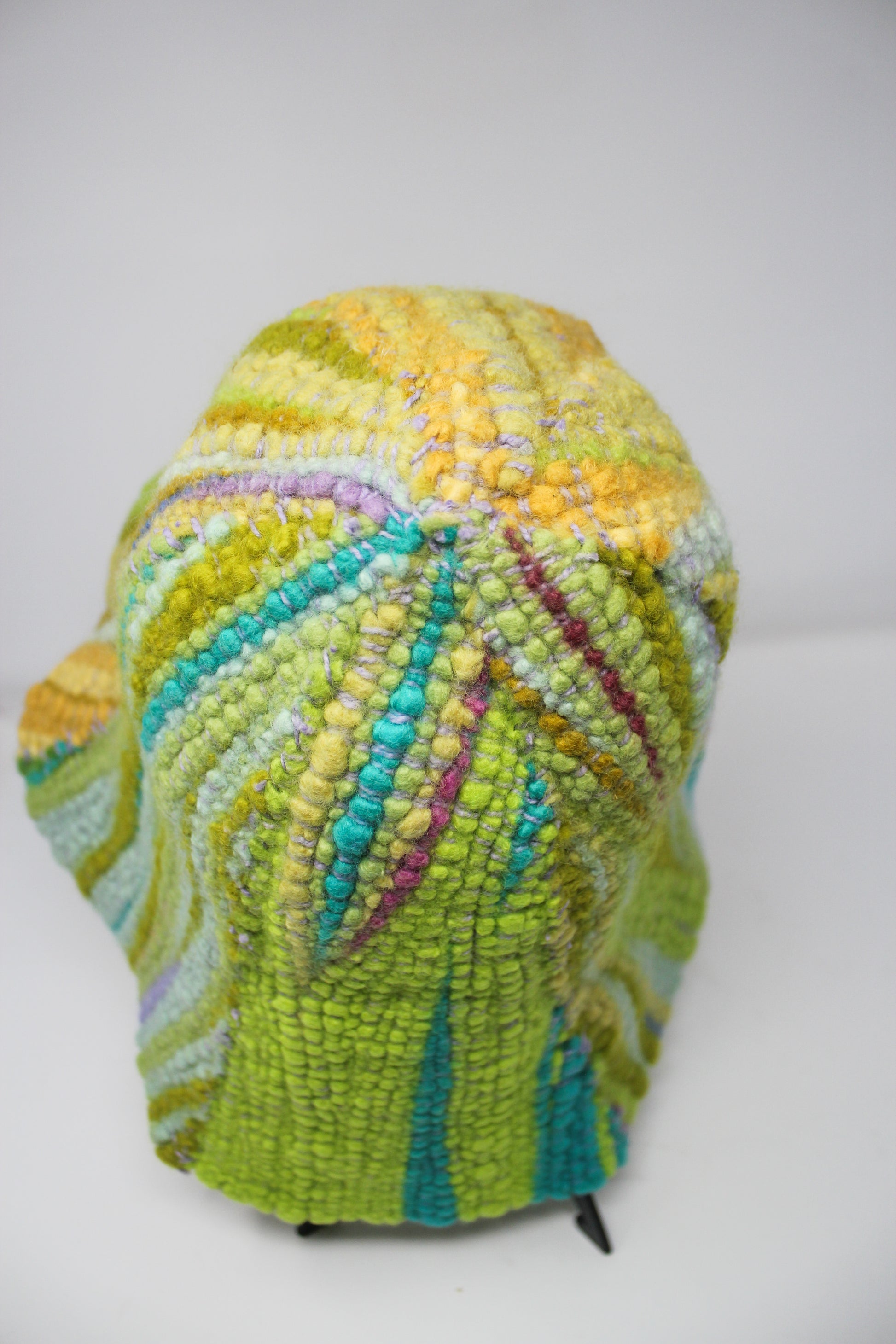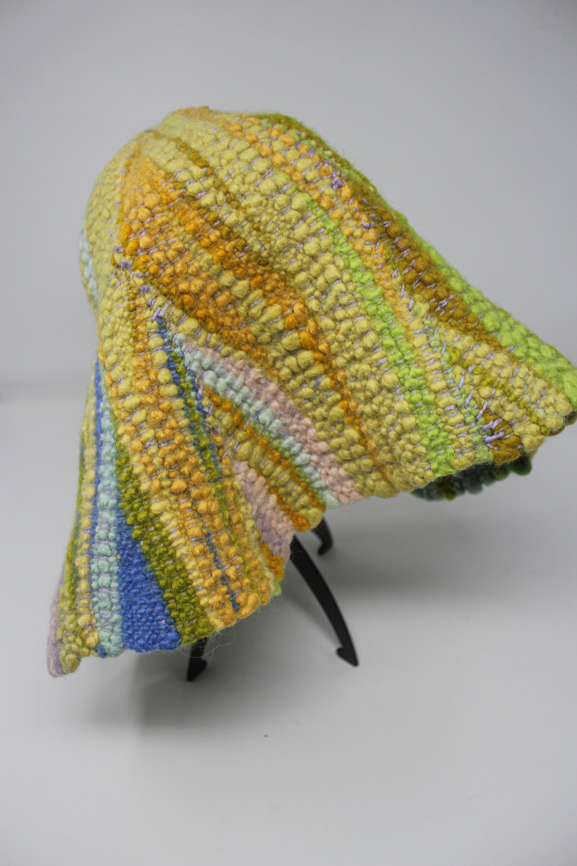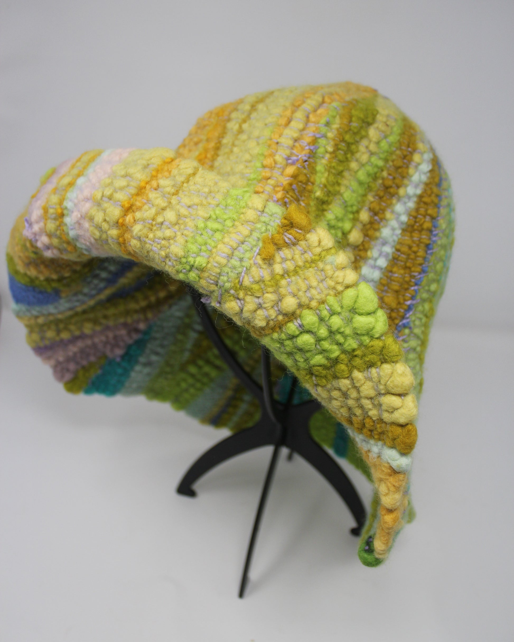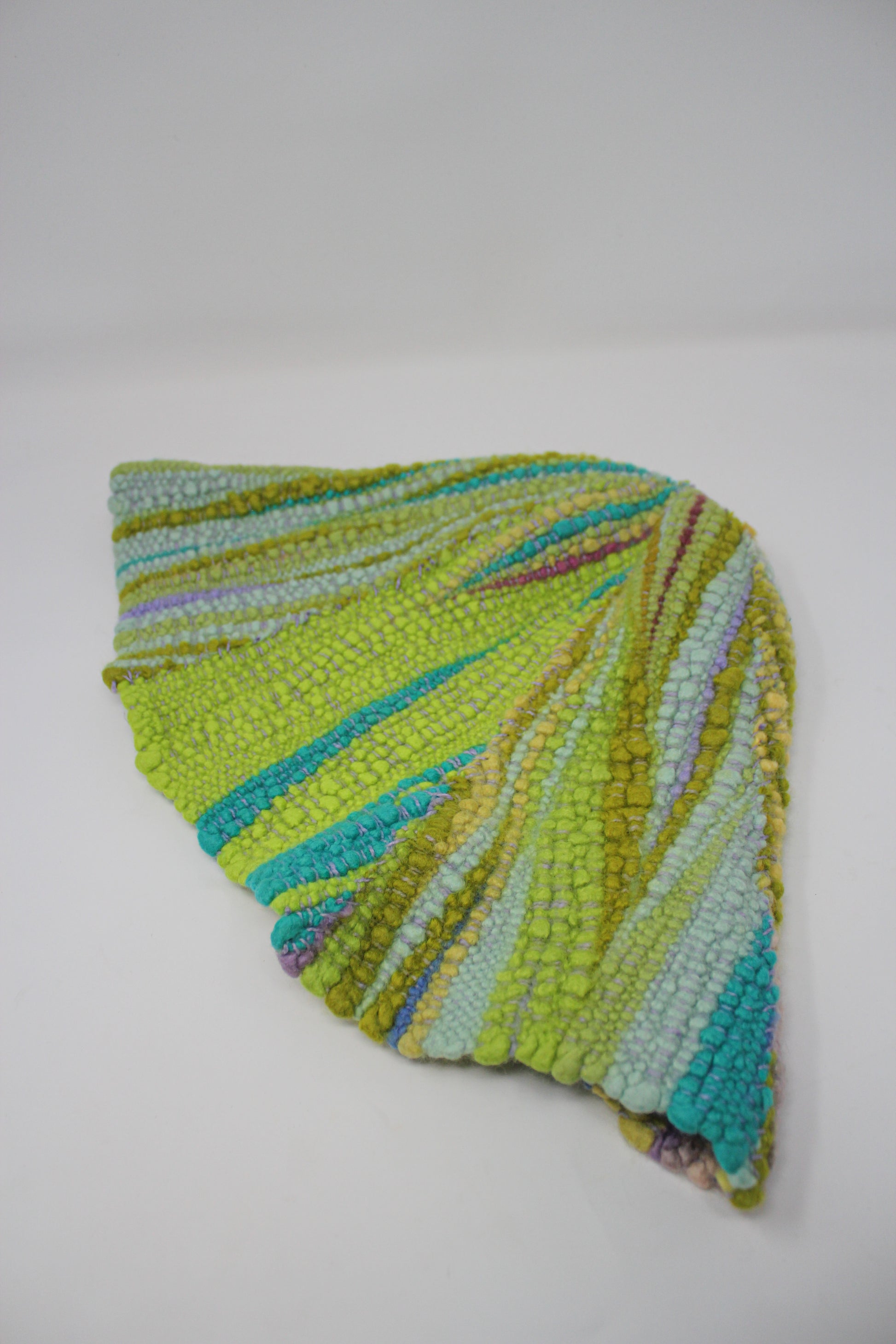 All panels are created using a mixture of colored merino wool woven together on a rigid heddle loom. After woven, the fabric is felted using a wet felting process, dried, and then cut and hand sewn into this design.
