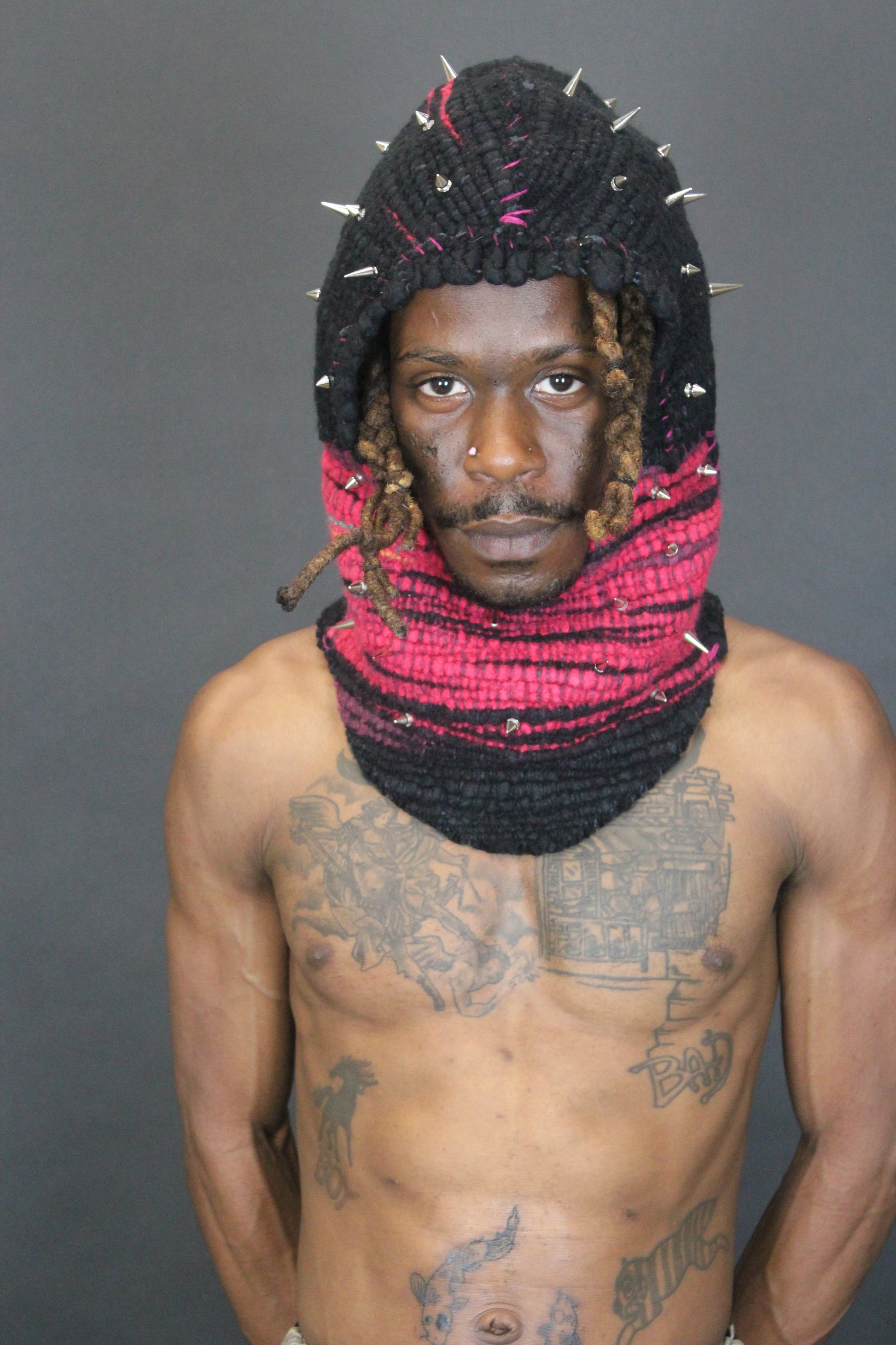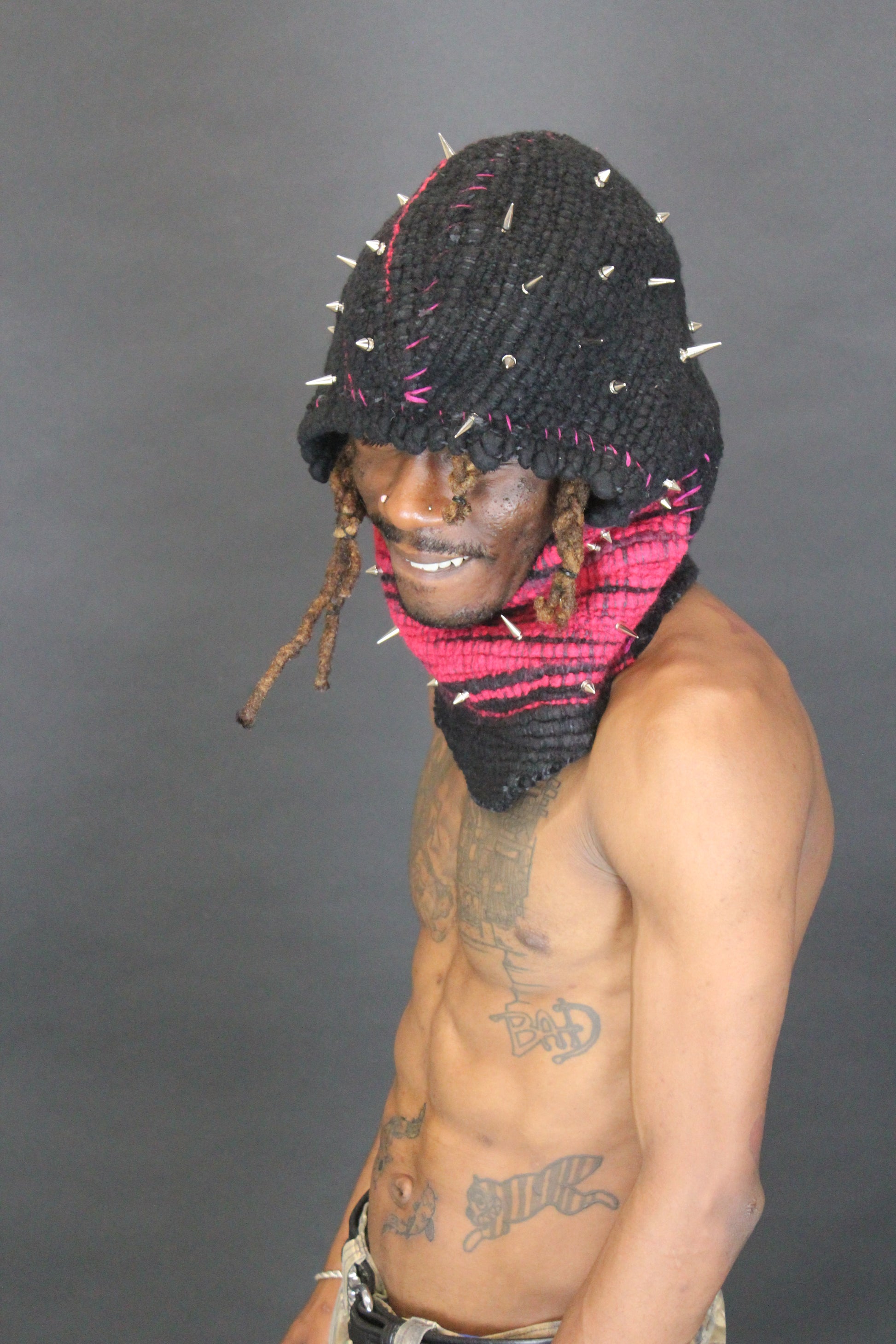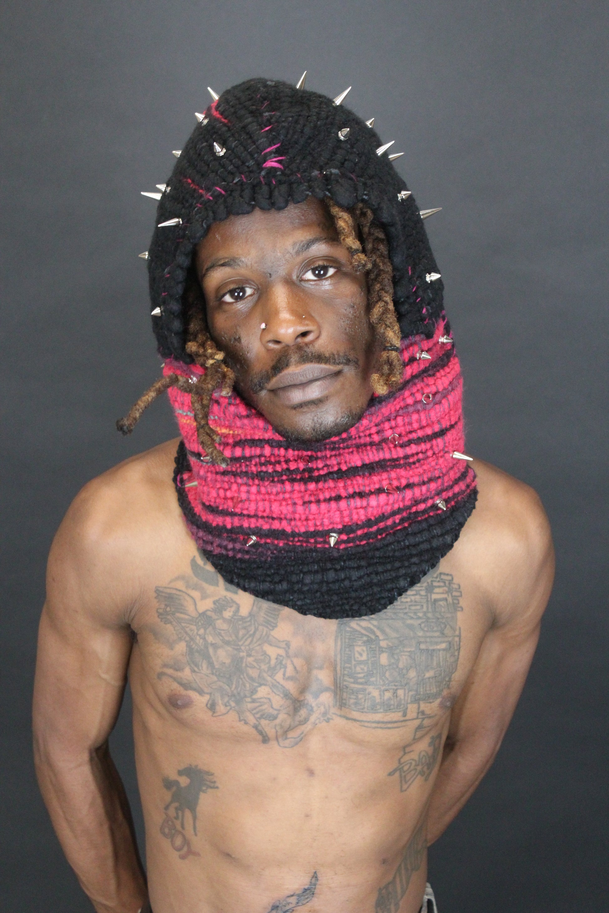 This hood is created by weaving ethically sourced merino wool on a cotton warp and then is hand stitched using pink wool thread. Once constructed, I screwed in spikes/ studs into the piece. The pieces are removable and can be tightened as needed.